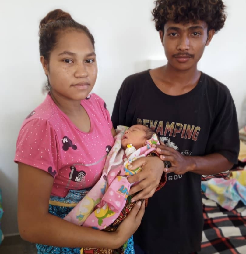 Anastacia ho nia la’en Jerico da Silva Borjes, kontenti simu kosok oan mane iha Ospital Regional Baucau, Karta (27/3/2024). Foto familia