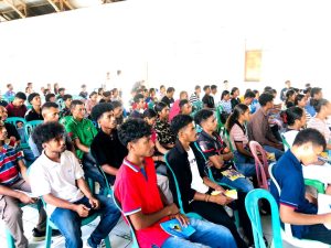 ‘ Tenke prepara abilidade no kapasidade hodi aprende Lian English, atu fasilita opurtunidade servisu iha Australia, hodi hetan rendimentu diaknunee sustenta ekonomia moris uma laran,” Mario Muni esplika durante Nia intervensaun iha atividade habelar informasaun ba Autoridade lokal kompostu husi Xefi Suku, Xefi Aldeia, joventude no estudante sira iha salaun parokia Numbei, Pante Makasár, Oe- cusse, Kinta-Feira (06/11/2025).